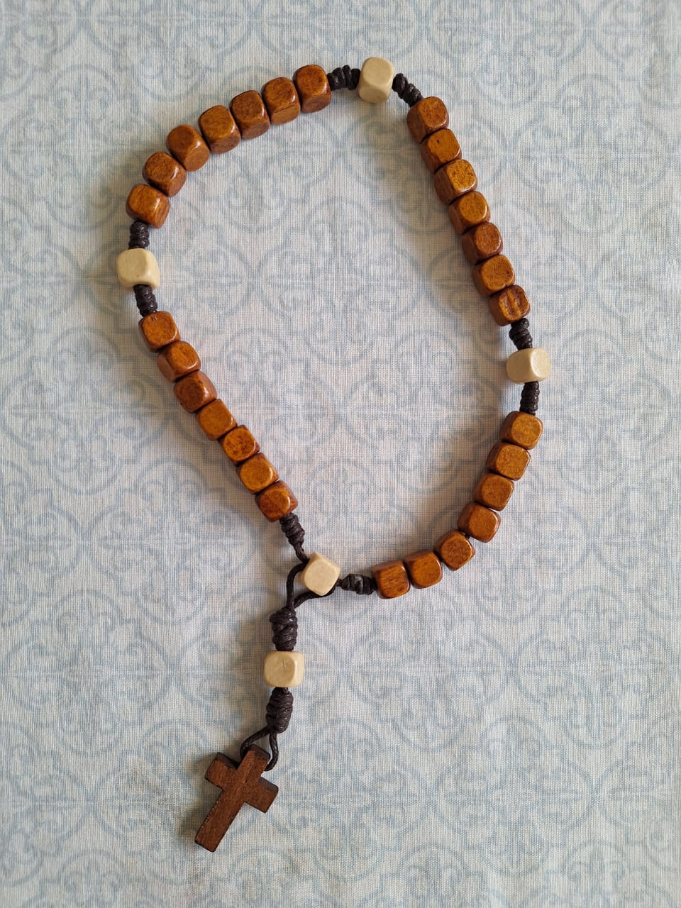 Rosário Anglicano em estilo franciscano com 33 contas e cruz em madeira de tons escuros e claros com cordão escuro.